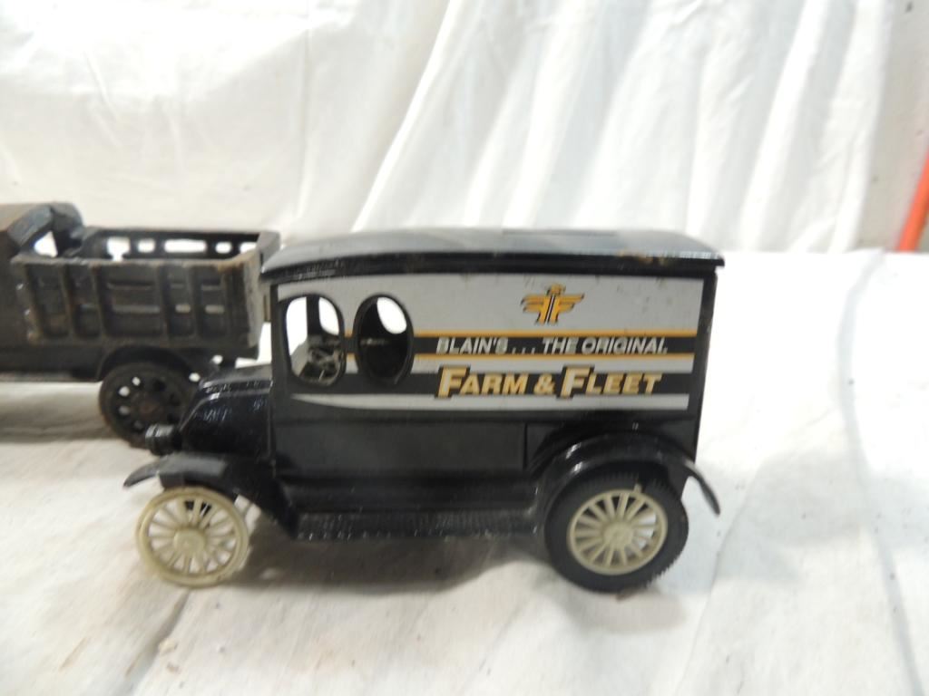 LOT 3 VINTAGE CAST IRON TRUCK, FARM & FLEET BANK,W