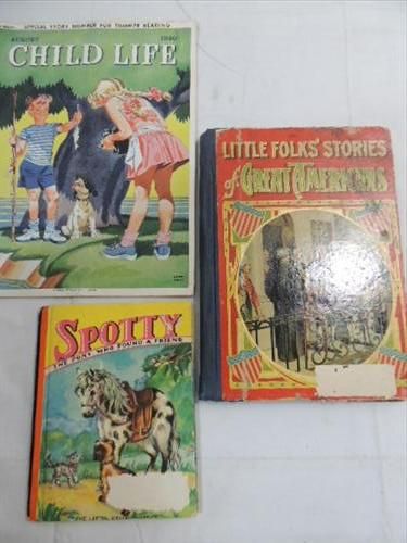 LOT 3 VINTAGE CHILDRENS BOOKS: 1898 GREAT AMERICANS, 1940 CHILD LIFE MAGAZINE, & SPOTTY THE PONY. AS SHOWN. VIEW PICTURE FOR DETAIL.