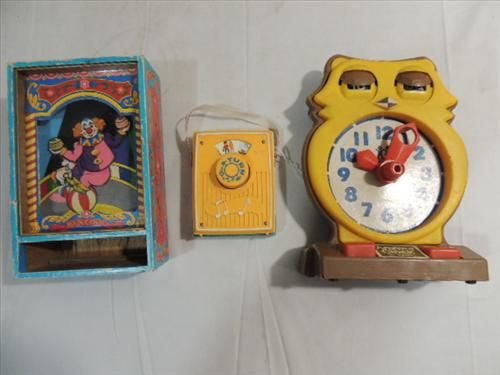 LOT 3 VINTAGE CHILDS ACTIVITY TOYS: TOMY ANSWER CLOCK, FISHER-PRICE MULBERRY BUSH MUSIC BOX, AND CLOWN MUSIC BOX. AS SHOWN. VIEW PICTURE FOR DETAIL.