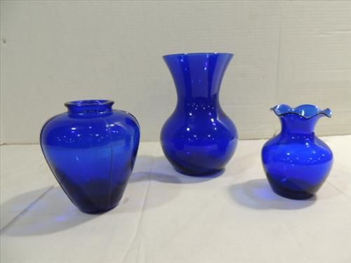 LOT 3 VINTAGE COBALT BLUE GLASS VASES. AS SHOWN. VIEW PICTURE FOR DETAIL.