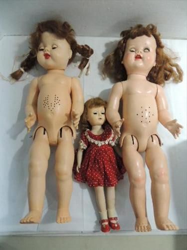 LOT 3 VINTAGE HARD PLASTIC DOLLS: (1) IDEAL TALKING, (1) IMPECO TALKING AND 1 UNMARKED DOLLS. AS SHOWN. VIEW PICTURE FOR DETAIL.
