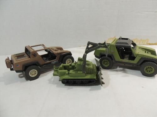 LOT 3 VINTAGE GI JOE VEHICLES: (2) 1982 VAMP JEEP,1985 BOMB DISPOSAL TRACTOR. AS SHOWN. VIEW PICTURE FOR DETAIL.