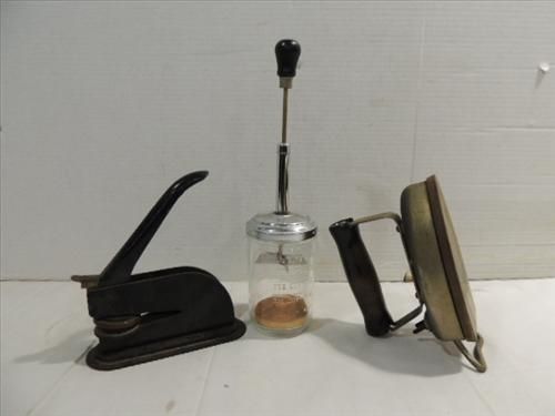 LOT 3 VINTAGE ITEMS: OLD ELECTRIC IRON, NOTARY EMBOSSER, HAND NUT CHOPPER. AS SHOWN. VIEW PICTURE FOR DETAIL.