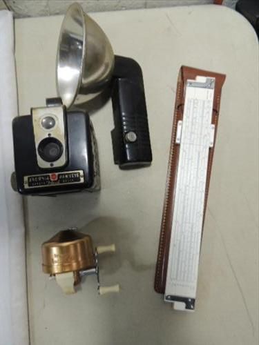 LOT 3 VINTAGE ITEMS: SLIDE RULE, BRONSON SAVAGE 910 FISHING REEL, KODAK BROWNIE HAWKEYE AND FLASH. AS SHOWN. VIEW PICTURE FOR DETAIL.
