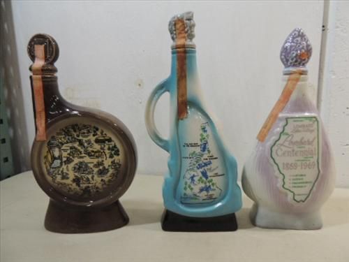 LOT 3 VINTAGE JIM BEAM WHISKEY CERAMIC DEANTERS: 1968 NEW HAMPSHIRE, 1968 ARIZONA & 1969 VILLAGE OF LOMBARD ILL. AS SHOWN. VIEW PICTURE FOR DETAIL.