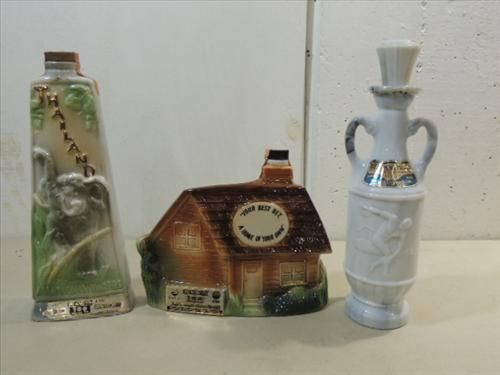 LOT 3 VINTAGE JIM BEAM WHISKEY CERMAIC DECANTERS: 1969 THAILAND, 1978 LOG CABIN AND GREEK URN.  AS SHOWN.  VIEW PICTURE FOR DETAIL.