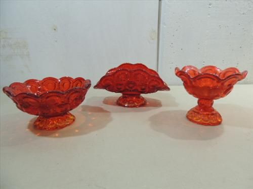 LOT 3 VINTAGE L.E. SMITH AMBERINA COMPOTE, BANANA BOAT AND PEDISTAL BASE BOWL. MOON & STAR PATTERN. AS SHOWN. VIEW PICTURE FOR DETAIL.