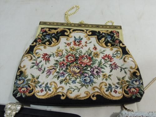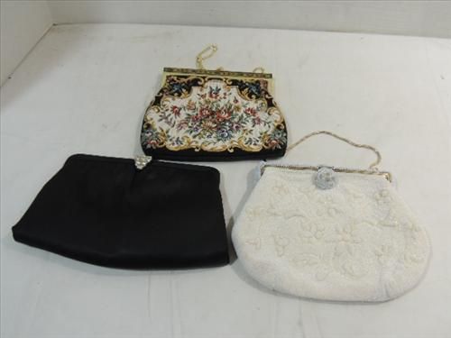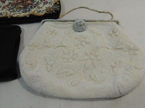 LOT 3 VINTAGE LADYS EVENING CLUTCH PURSES, 1 WITH BEADED. AS SHOWN. VIEW PICTURE FOR DETAIL.