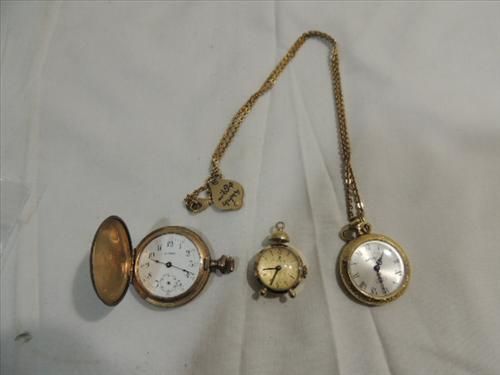 LOT 3 VINTAGE LADYS GOLD TONE POCKET WATCHES. ARNEX, SOVEREIGN. AS SHOWN. VIEW PICTURE FOR DETAIL.
