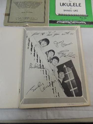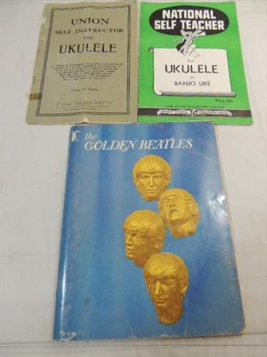 LOT 3 VINTAGE MUSIC BOOKS: 1964 BEATLES GUITAR & PIANO MUSIC & PHOTO BOOK OF 1964 & 65. 2 BOOKS ON LEARNING THE UKULELE. AS SHOWN. VIEW PICTURE FOR DETAIL.