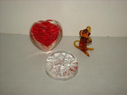LOT INCLUDES: CRISTAL SNOWFLAKE PAPERWEIGHT, 3.75" PAPERWEIGHT HEART PEN HOLDER, AND 3" PILGRAM GLASS MOUSE. AS SHOWN. VIEW PICTURE FOR DETAIL.