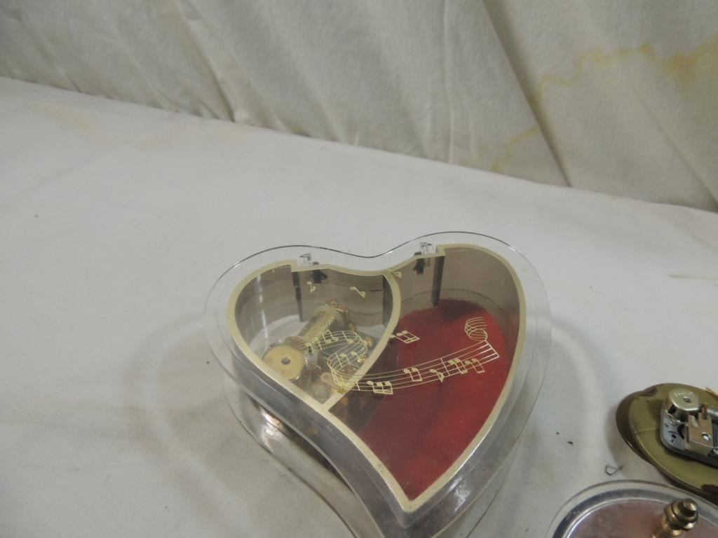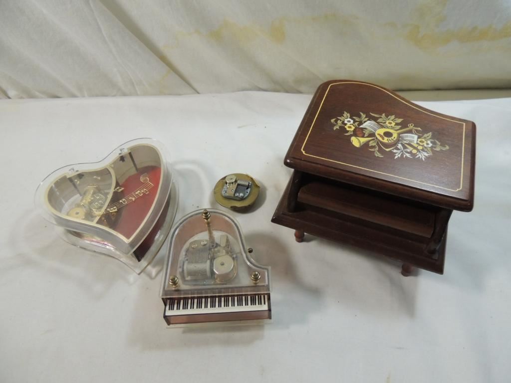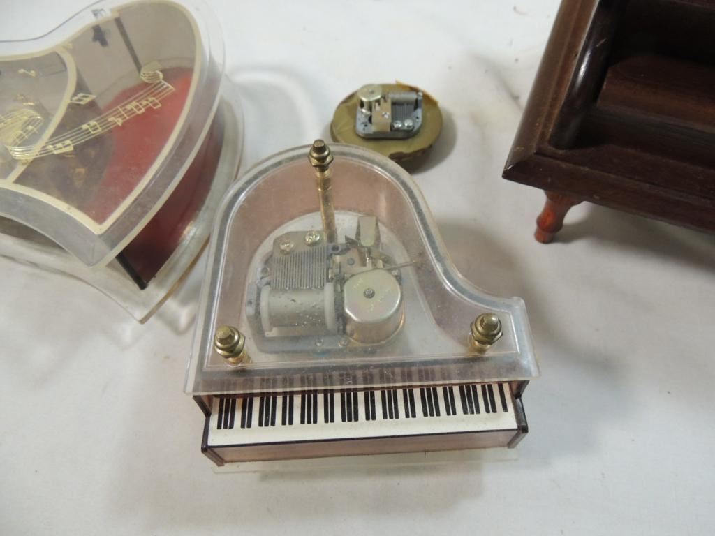 GRAND PIANO MUSIC BOXES, WOODEN PLASTIC HEART MUSIC BOXES AS SHOWN SEE PHOTO FOR MORE DETAILS.
