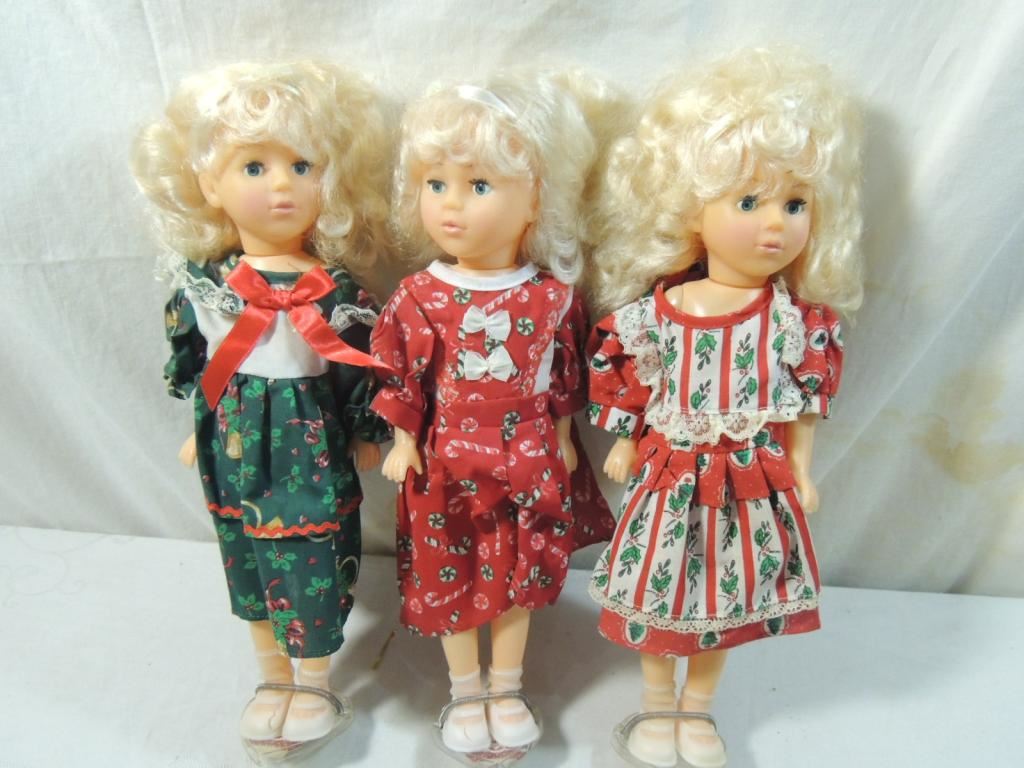 THREE VINTAGE PLASTIC DOLLS 13" DOLL, PLASTIC DOLLS, HOLIDAY DRESSES, AS SHOWN SEE PHOTO FOR MORE DETAILS.