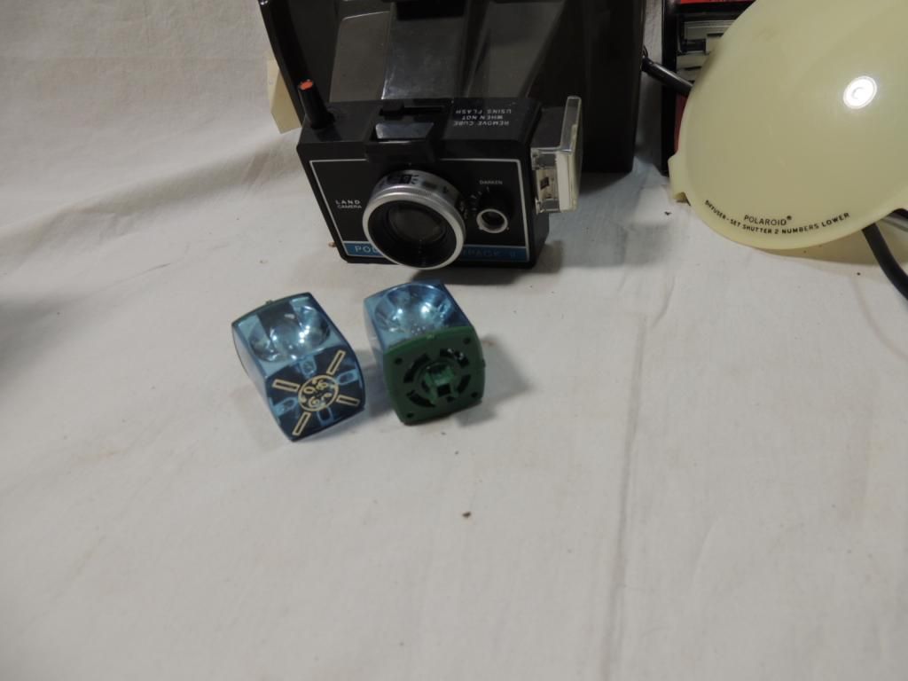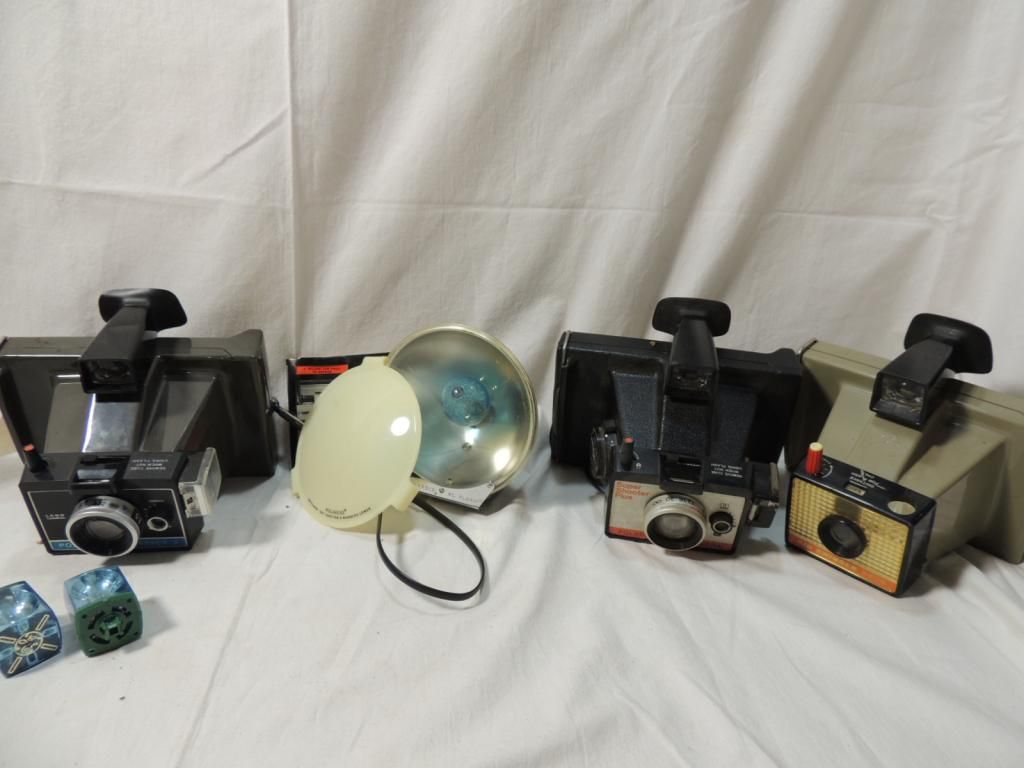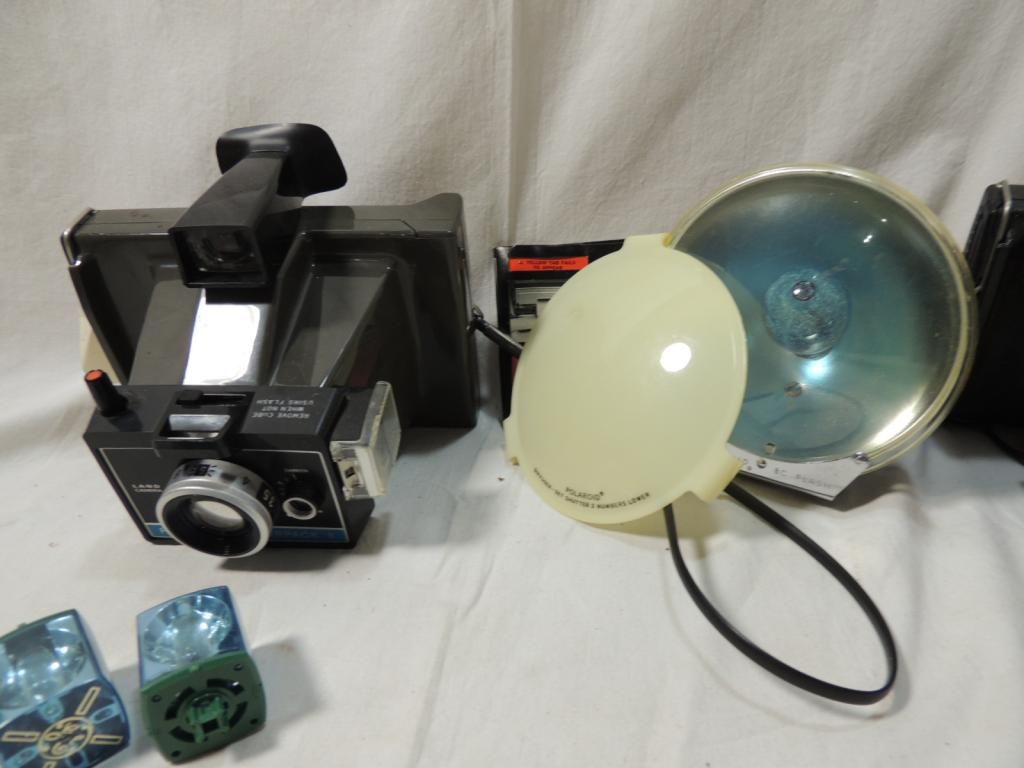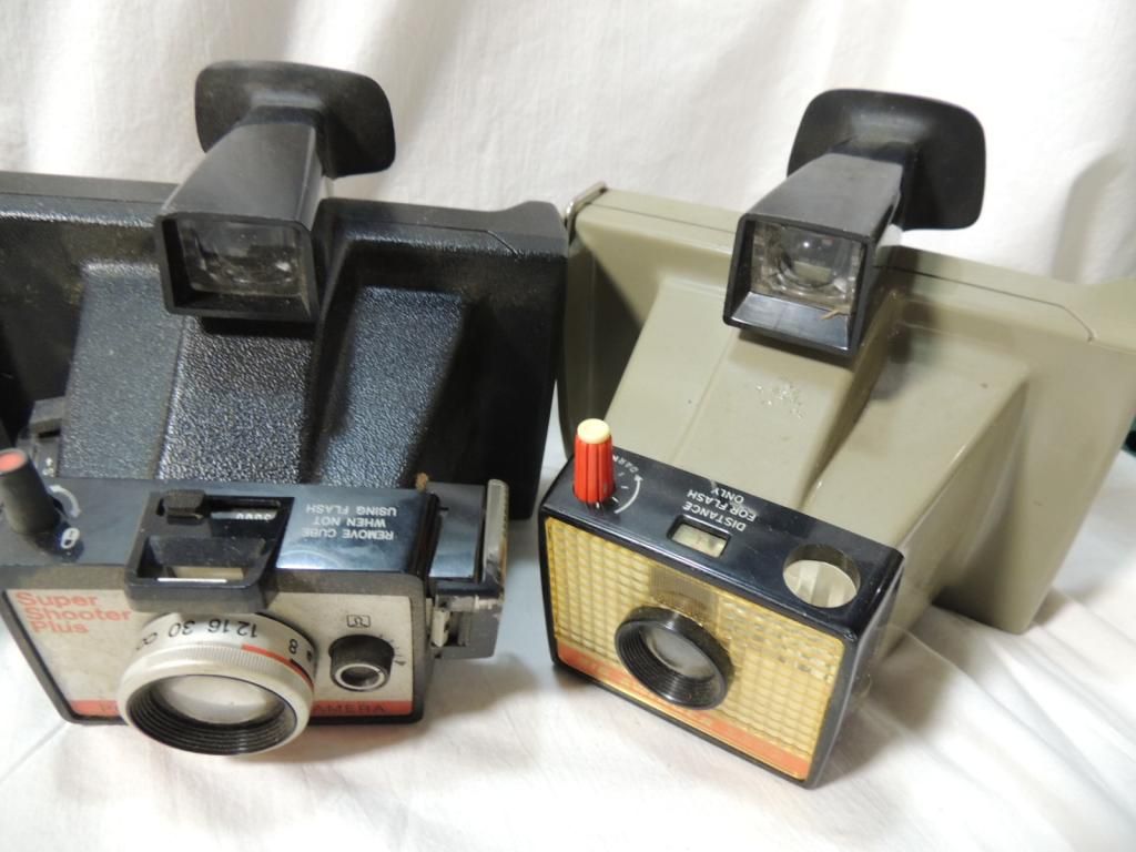 VINTAGE POLAROID CAMERAS. POLAROID LAND CAMERA SIPER SHOOTER PLUS, POLAROID LAND CAMERA BIG SWINGER 3000, POLAROID COLORPACK WITH SOME FILM AND PHOTOS VINTAGE PHOTOGRAPHY. FLASH ATTACHMENT. AS SHOWN. SEE PHOTO FOR MORE DETAILS.