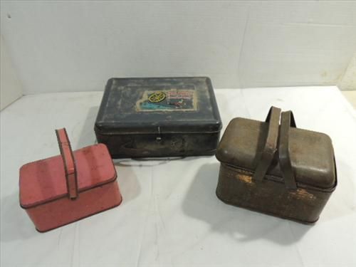 LOT 2 VINTAGE PRESSED METAL HANDLED UNION PLUG TIN, GENERIC PINK TIN & DOLL CLOTHES CARRY CASES: 1 PRESS METAL WITH DOLL CLOTHES & PATTEN LEATHER CASE WITH DOLL. BOTH WITH LIDS AND HANDLES. AS SHOWN. VIEW PICTURE FOR DETAIL.