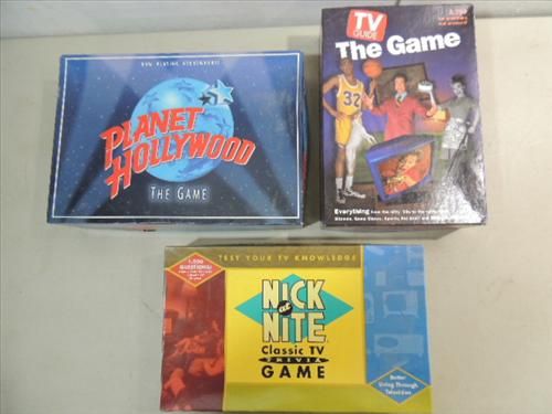 LOT 3 VINTAGE TRIVIA BOARD GAMES: 1999 NICK NITE, 1997 PLANET HOLLYWOOD AND 1998 TV GUIDE GAME. AS SHOWN. VIEW PICTURE FOR DETAIL.