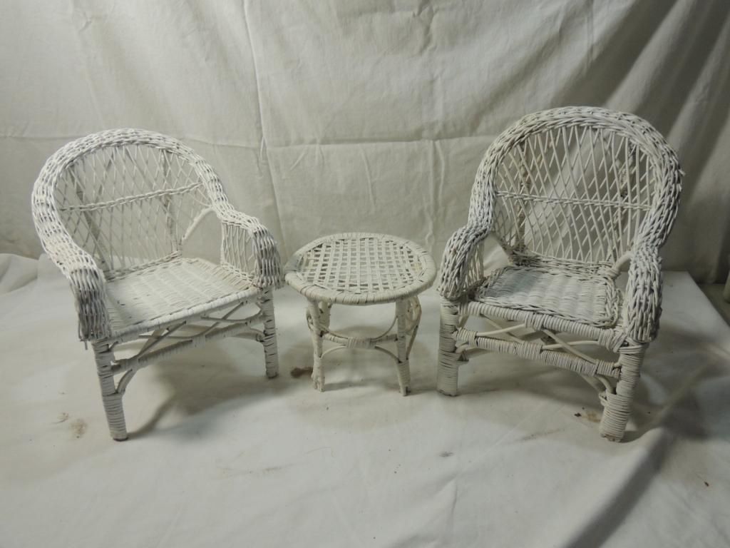 NICE SMALL WHITE WRICKER OR RATTAN DOLL CHAIRS AND SMALL ROUND WICKER TABLE AS SHOWN SEE PHOTO FOR MORE DETAILS.