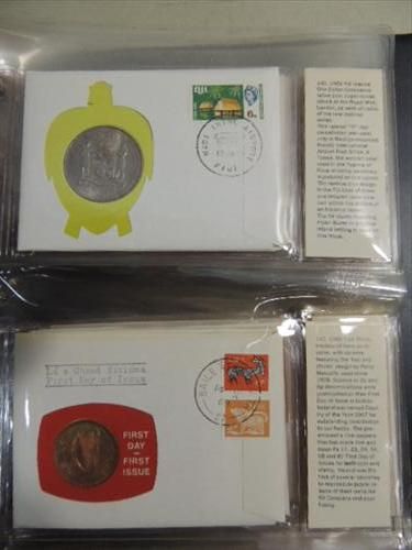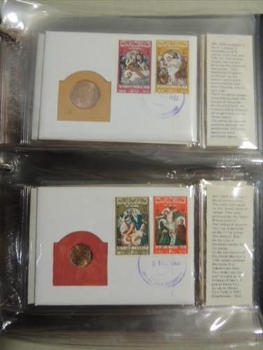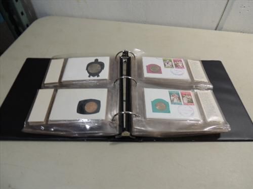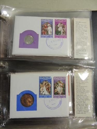 LOT 32 FOREIGN COIN & POSTAGE ON COVER COLLECTION IN RING BINDER. INCLUDES A SHORT HISTORY OF EACH COIN & COUNTRY. AS SHOWN. VIEW PICTURE FOR DETAIL.