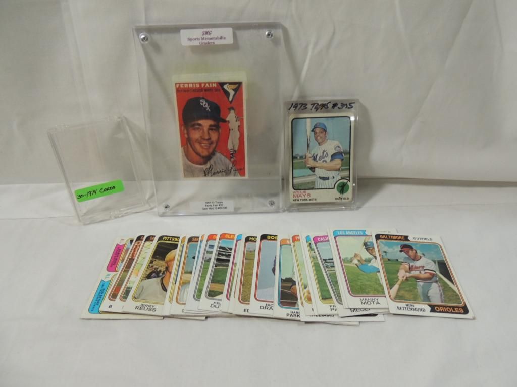 1973 TOPPS WILLIE MAYS BASEBALL PLAYER CARD #305, 1954 SI TOPPS GARRIS FAIN #27 GRADED CARD. 1974 TOPPS BASEBALL AS SHOWN. SEE PHOTO FOR MORE DETAILS.