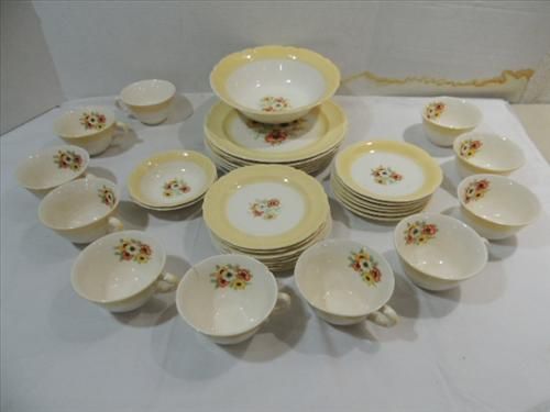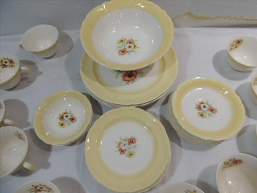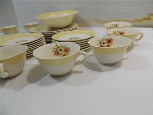 LOT 32 VINTAGE FRENCH SAXON CHINA POPPY PATTERN. 6 DINNER PLATES, 1 SERVING BOWL, 9 COFFE CUPS, 2 DESSERT BOWLS, 6 SAUCERS AND 8 SALAD PLATES. AS SHOWN. VIEW PICTURE FOR DETAIL.