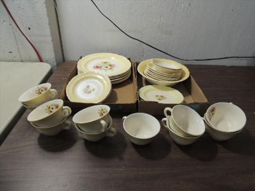 LOT 32 VINTAGE FRENCH SAXON CHINA POPPY PATTERN. 6 DINNER PLATES, 1 SERVING BOWL, 9 COFFE CUPS, 2 DESSERT BOWLS, 6 SAUCERS AND 8 SALAD PLATES. AS SHOWN. VIEW PICTURE FOR DETAIL.