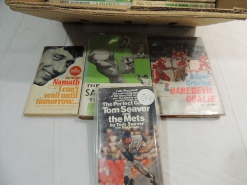 LOT 33 VINTAGE SPORTS BIOGRAPHIES & FACTS BOOKS. GIFFORD, SEAVER, ALL KINDS OF REFERENCE BOOKS. AS SHOWN. VIEW PICTURE FOR DETAIL.