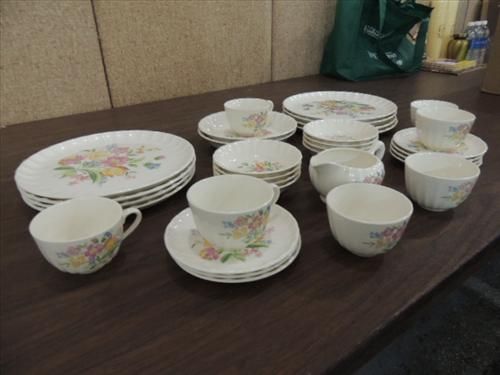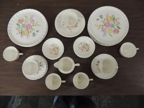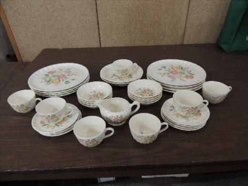 LOT 33 VINTAGE W.S. GEORGE CHINA: 8 DINNER PLATES, 8 BERRY BOWLS, 7 CUPS, 7 SAUCERS, 2 SOUP BOWLS, 1 CREAMER. AS SHOWN. VIEW PICTURE FOR DETAIL.
