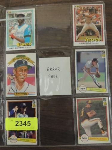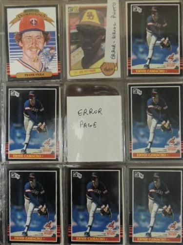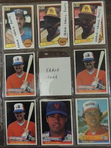 LOT 37 ASSORTED ERROR BASEBALL CARDS: JOE PITTMAN, MIKE STEN HOUSE,ERNIE CAMACHO, JIM PANKOVITZ AND MORE. AS SHOWN. VIEW PICTURE FOR DETAIL.