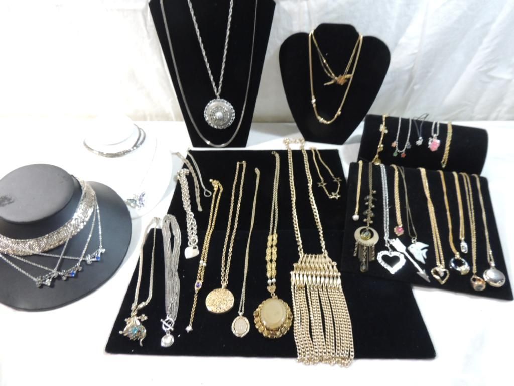 ASSORTED NECKLACES, GOLDTONE, SILVERTONE, STONE, PENDANTS, COLORFUL, NAME NECKLACES, HEARTS, LOCKETS, LONG AND CHOCKER, FASHION JEWELRY, COSTUME JEWELRY AS SHOWN SEE PHOTO FOR MORE DETAILS.