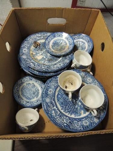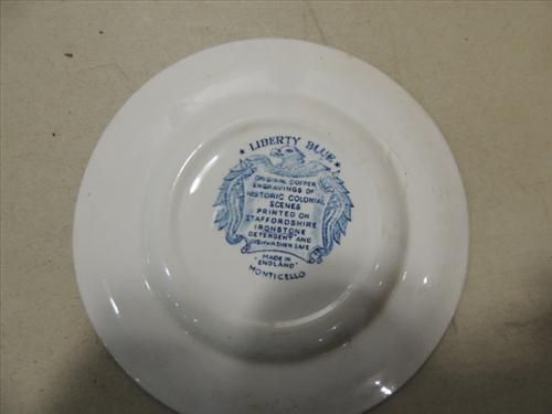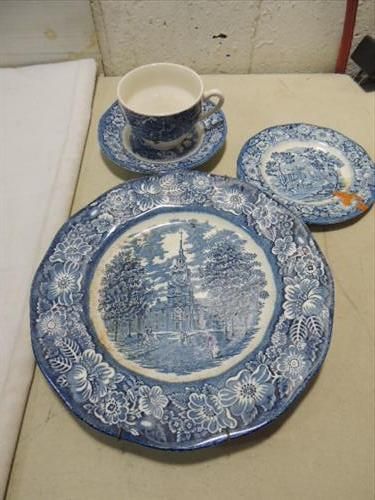 LOT 39 VINTAGE STAFFORDSHIRE IRONSTONEWARE, LIBERTY BLUE CHINA. 15 DINNER PLATES, 7 COFFEE CUPS, 11 SAUCERS, 6 DESSERT PLATES. AS SHOWN. VIEW PICTURE FOR DETAIL.