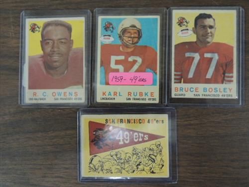 LOT 4 1959 TOPPS FOOTBALL CARDS: #112, 166, 111, 33. ALL 49ER'S. AS SHOWN. VIEW PICTURE FOR DETAIL.