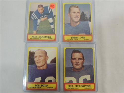 LOT 4 1963 TOPPS FOOTBALL PLAYER CARDS: #6, 3, 10, 11. AS SHOWN. VIEW PICTURE FOR DETAIL.