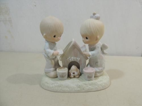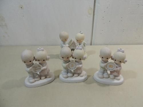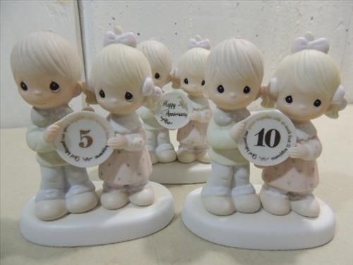 LOT 4 1981-83 PRECIOUS MOMENTS PORCELAIN FIGURINES: HAPPY ANNIV, 5 YEAR ANNIV, 10 YEAR ANNIV, BLESS THIS HOUSE. AS SHOWN. VIEW PICTURE FOR DETAIL.