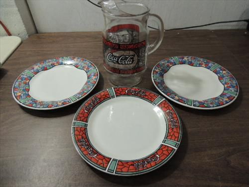 LOT 4 1996 COCA-COLA (3) 10.5" DINNER PLATES & 1 GLASS WATER PITCHER. AS SHOWN. VIEW PICTURE FOR DETAIL.