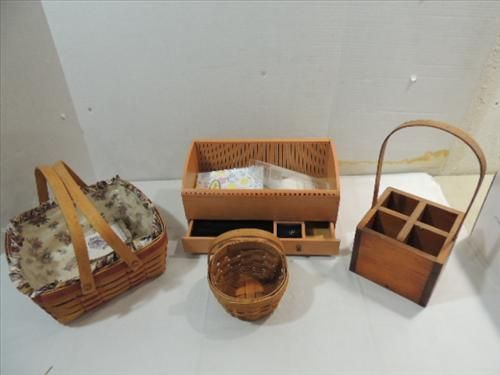 LOT 4 (2) 1992 LONGABERGER WOOD WOVEN BASKETS & 2 WOODEN ORGANIZERS: 1 RECEIPE TRAY & UTENCIL HOLDER. AS SHOWN. VIEW PICTURE FOR DETAIL.