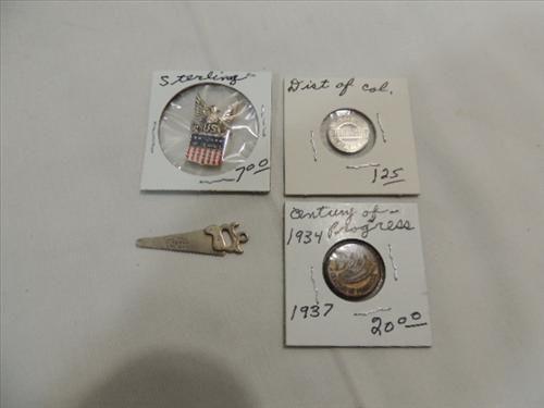 LOT 4 (2) STERLING SILVER CHARM & LAPEL PIN, 2 COINS: DISTRICT OF COLUMBIA BUS FARE & 1934 CENTURY OF PROGRASS. AS SHOWN. VIEW PICTURE FOR DETAIL.