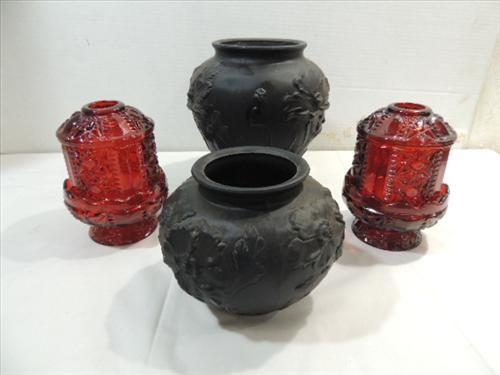 LOT 4 (2) VINTAGE RUBY RED GLASS CANDLE HOLDERS & 2 BLACK GLASS VASESWITH FLORAL PATTERN. AS SHOWN. VIEW PICTURE FOR DETAIL.