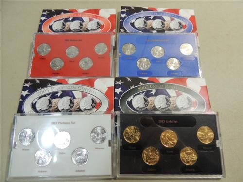 LOT 4 2003 STATE QUARTER SETS: GOLD, PLATINUM, DENVER, PHILADELPHIA. 5 COINS PER SET. AS SHOWN. VIEW PICTURE FOR DETAIL.