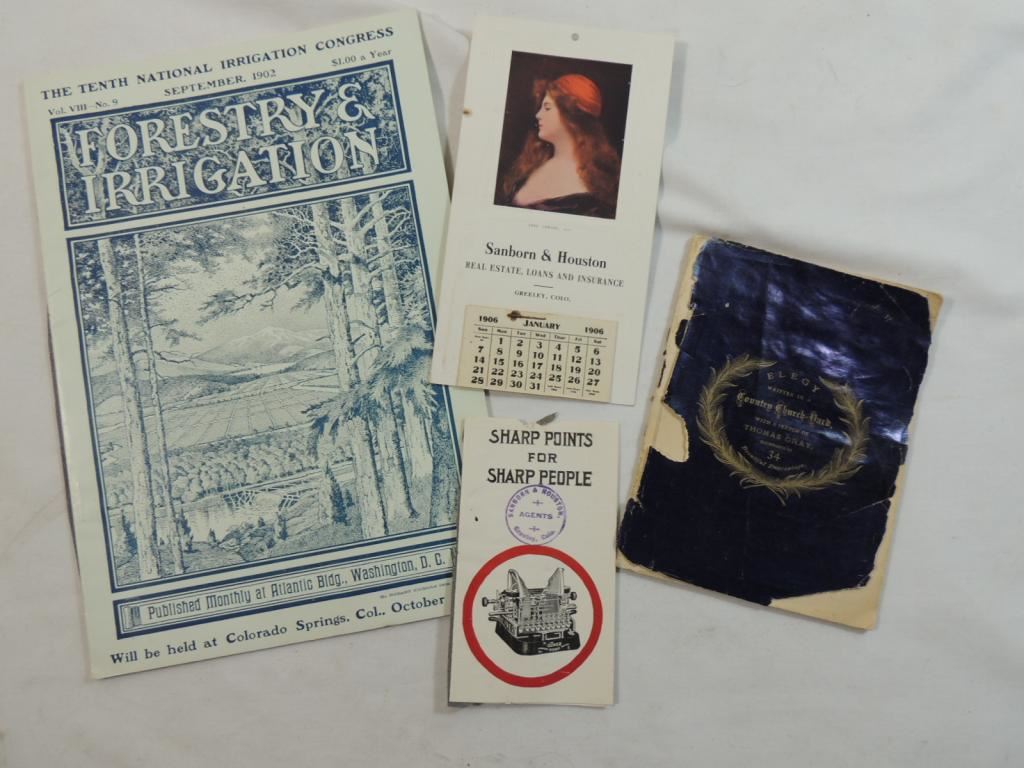 FORESTRY & IRRIGATION 1902 BOOKLET, ELEGY WIRTTEN IN A COUNTRY CHURCH BOOKLET, 1902 PROMOTIONAL CALENDAR, OLIVER TYPEWRITER PROMOTION. EMPEMRA COLLECTIBLE PAPER COLLECTIBLES, AS SHOWN SEE PHOTO FOR MORE DETAILS.