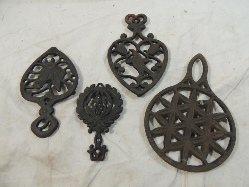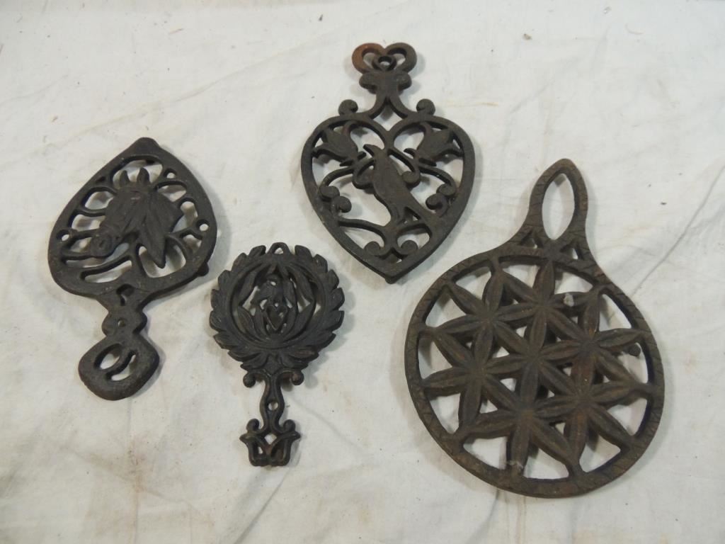 DECORATIVE CAST IRON TRIVETS, ANTIQUE, WALL HANGING, USEFUL, IRON HEAT STAND, CAST IRON ANTIQUE VINTAGE TRIVETS, AS SHOWN SEE PHOTO FOR MORE DETAILS.