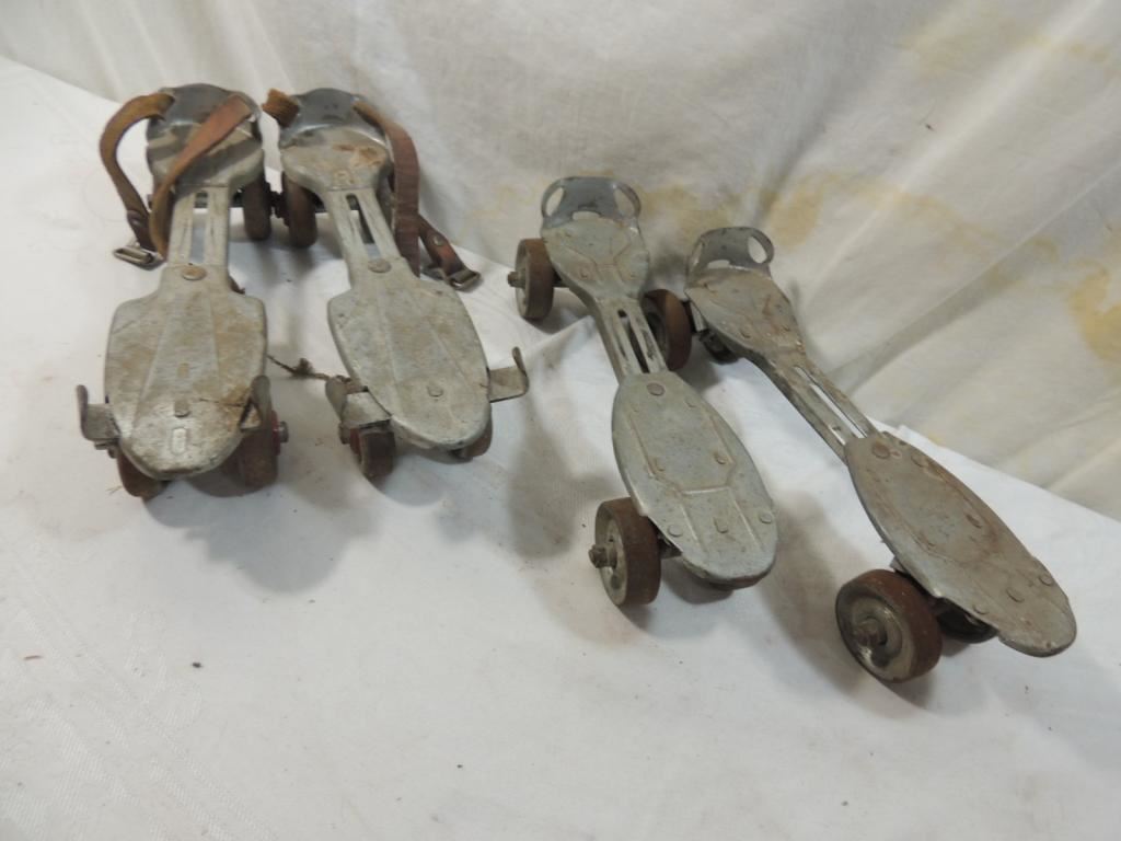 ANTIQUE ROLLER SKATES, VINTAGE SKATES, VINTAGE ADJUSTABLE STRAP ON SKATES AS SHOWN SEE PHOTO FOR MORE DETAILS.