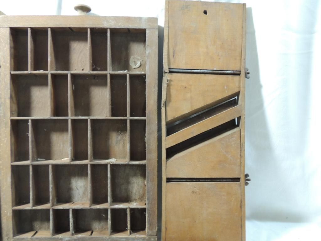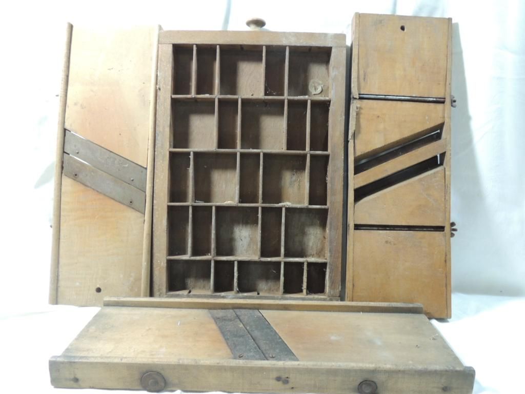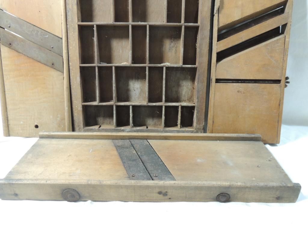 ANTIQUE SLICERS AND DISPLAY CASE. PRIMATIVE SLICER. AS SHOWN SEE PHOTO FOR MORE DETAILS.