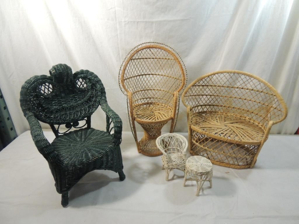 DOLL FURNITURE, DOLL CHAIRS, WICKER CHAIRS, WICKER FURNITURE, DECORATIVE CHAIRS, VINTAGE CHAIRS, VINTAGE FURNITURE, ACCESSORIES, AS SHOWN SEE PHOTO FOR MORE DETAILS.