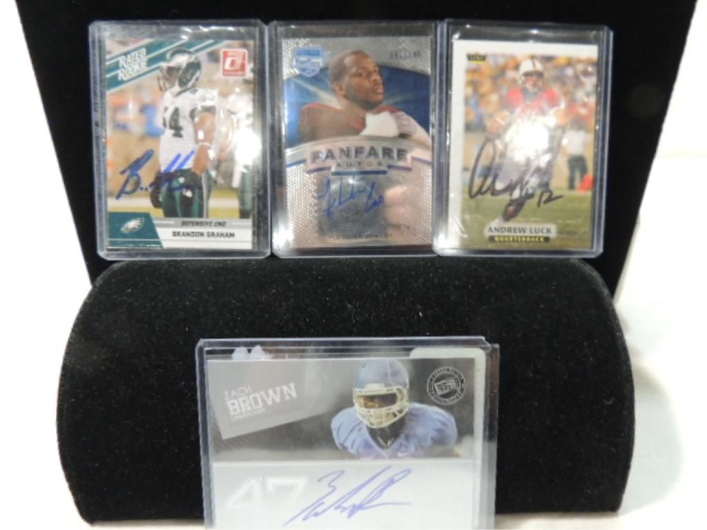 ANDREW LUCK, BRANDON GRAHAM, FLETCHER COX, ZACH BROWN AUTOGRAPHED PLAYER CARDS. MIXED MAKERS, UNGRADED. SEE PHOTOS FOR MORE DETAIL.