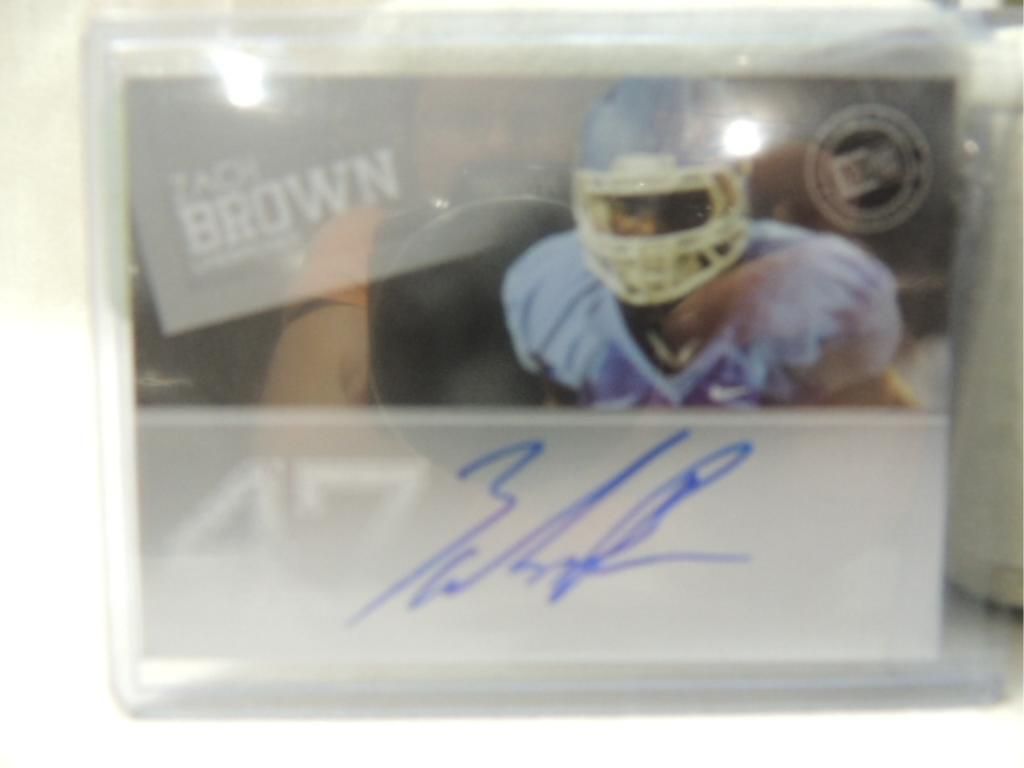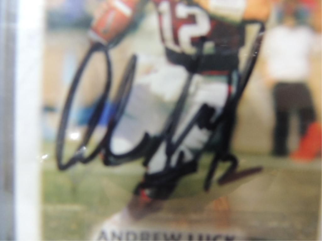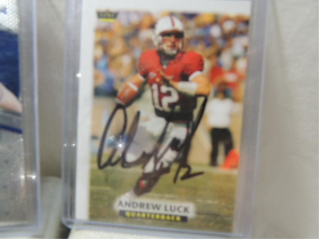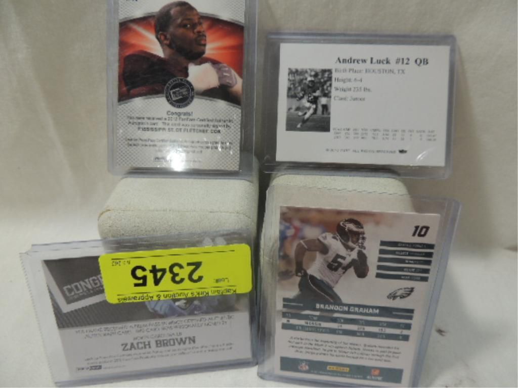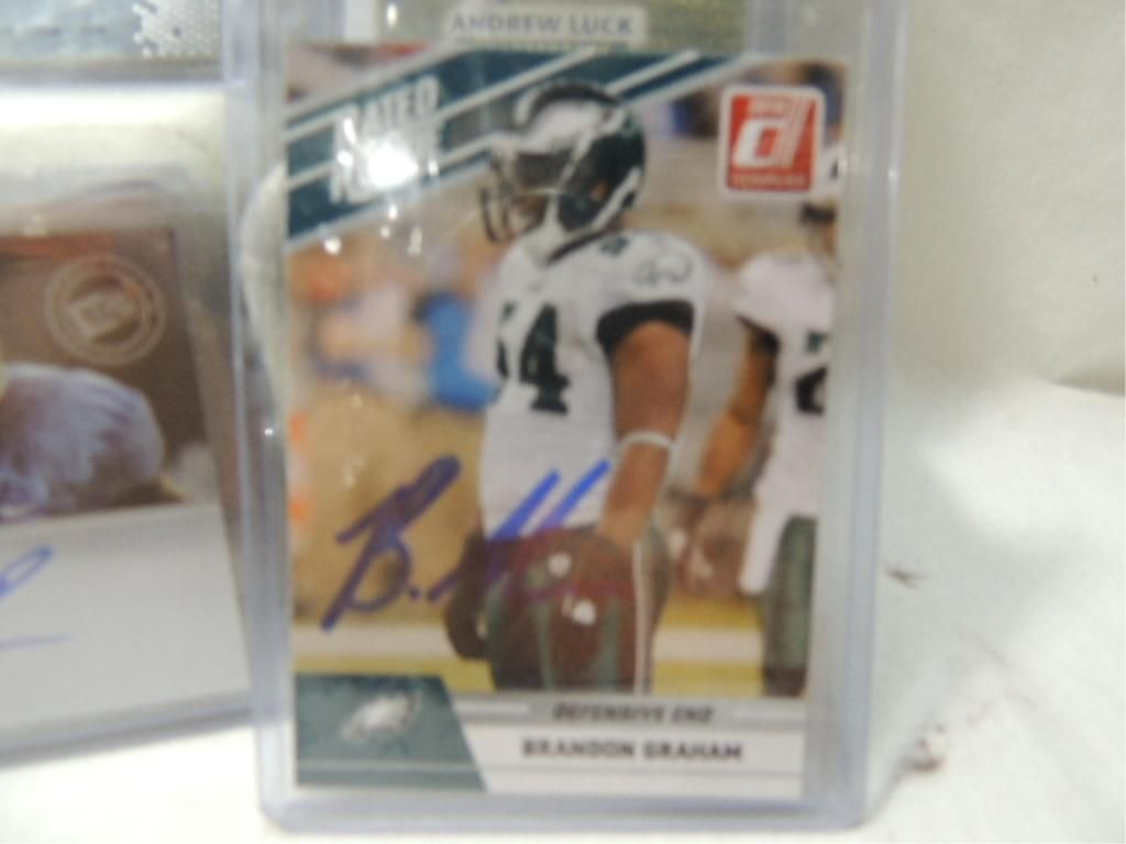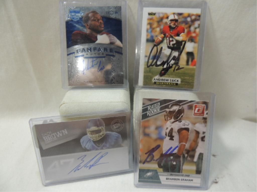 ANDREW LUCK, BRANDON GRAHAM, FLETCHER COX, ZACH BROWN AUTOGRAPHED PLAYER CARDS. MIXED MAKERS, UNGRADED. SEE PHOTOS FOR MORE DETAIL.PLEASE BE ADVISED, AND INFORMED REGARDING SIGNATURES OR AUTOGRAPHS THAT WE SELL AT AUCTION: WE ARE NOT AUTHENTICATORS, AND WE DO NOT AUTHENTICATE, OR VALIDATE ANY AUTOGRAPHS OR SIGNATURES THAT WE OFFER AT AUCTION. SOME AUTOGRAPHS OR SIGNATURES MAY COME WITH AN AUTHENTICATION FROM ANY ONE OF LITERALLY HUNDREDS OF AUTHENTICATORS ACROSS THE COUNTRY, AND AROUND THE WORLD. WE DO NOT ENDORSE ANY AUTHENTICATOR, NOR DO WE GUARANTEE THAT ANY AUTOGRAPH OR SIGNATURE IS AUTHENTIC, OR THAT IT WILL PASS AUTHENTICATION BY ANY AUTHENTICATOR. ALL AUTOGRAPHS OR SIGNATURES ARE SOLD