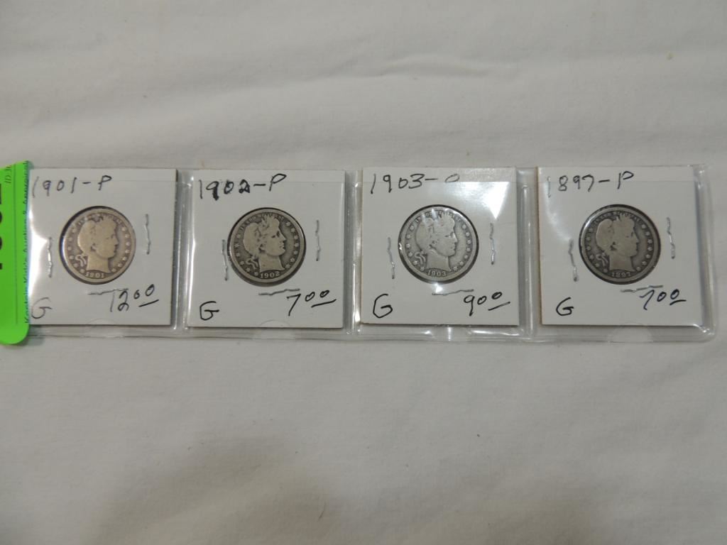 1901, 1902, 1903, 1897 BARBER QUARTERS US CURRENCY, CURRENCY COIN COLLECTIBLE, COLLECTIBLE AS SHOWN SEE PHOTO FOR MORE DETAILS.