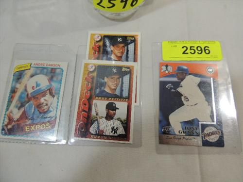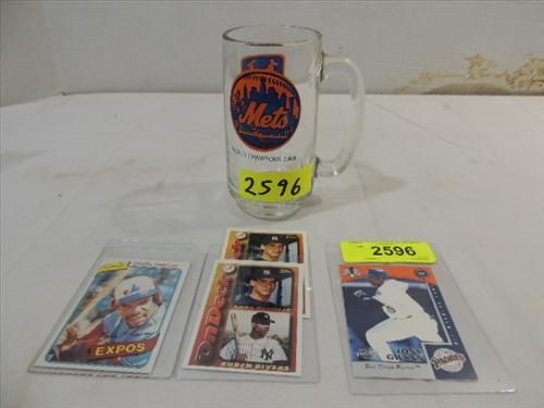 LOT 4 BASEBALL PLAYER CARDS (TONY GWYNN, ANDRE DAWSON, ANDY PETTITTE) & 1969 NEW YORK METS GLASS MUG. AS SHOWN. VI EWPICTURE FOR DETAIL.