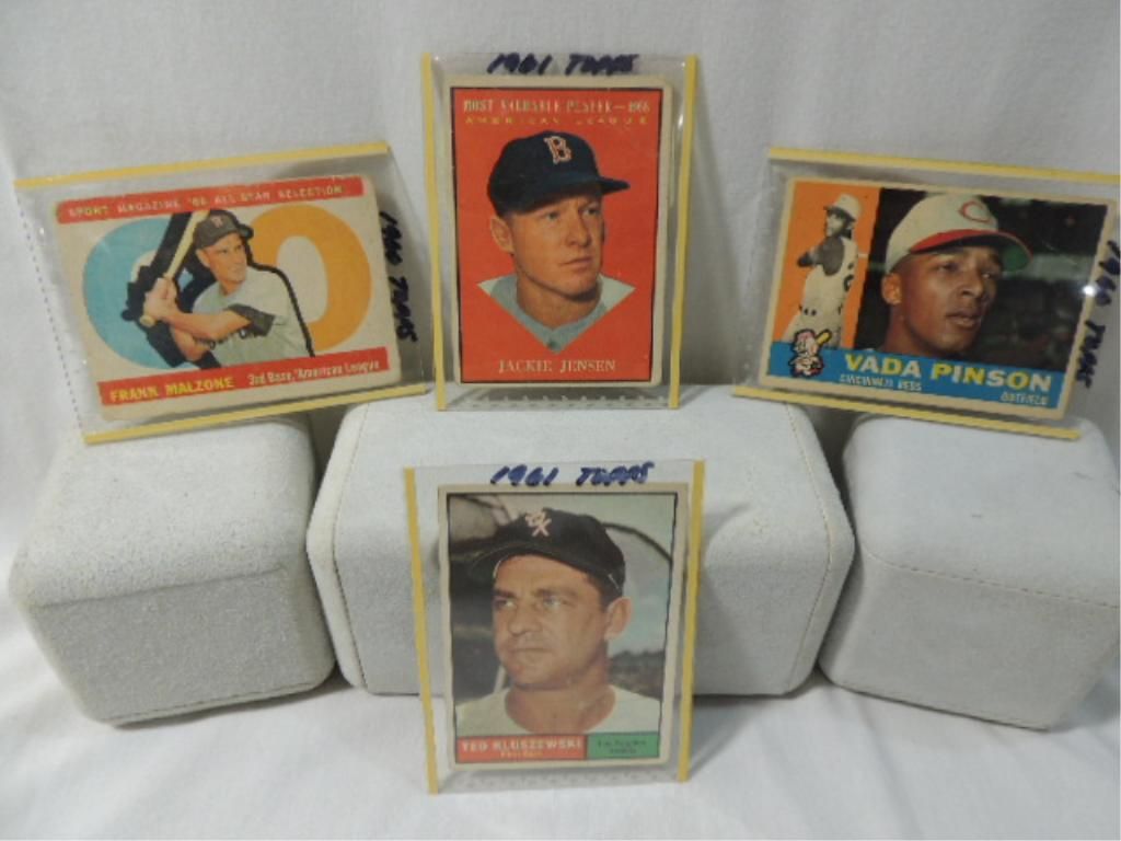 1961 TOPPS MVP CARD JACKIE JENSEN. 1961 TOPPS #65 TED KLUSZEWSKI. 1960 TOPPS #176 VADA PINSON. 1960 TOPPS #557 FRANK MALZONE. AS SHOWN. SEE PHOTO FOR DETAILS.