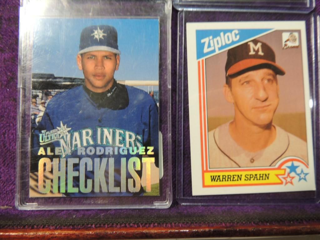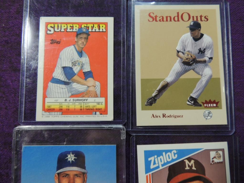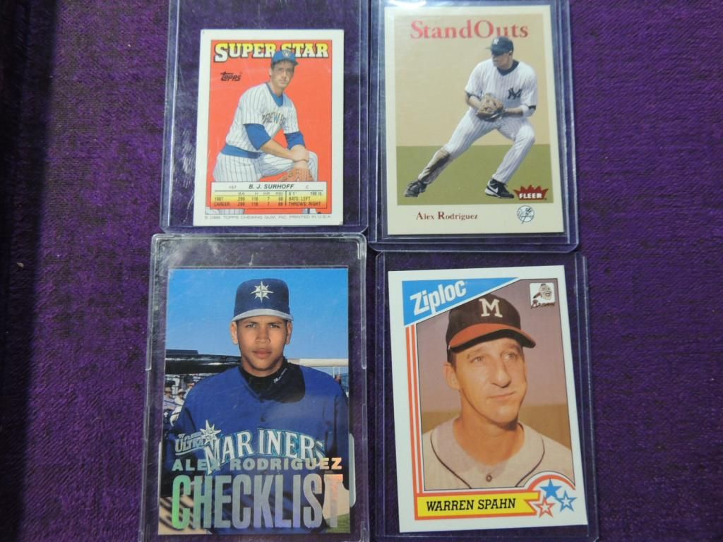 ALEX RODRIGUEZ, BJ SURHOFF, WARREN SPAHN, ALEX RODRIGUEZ. BASEBALL CARD. TRADING CARD. MIXED MAKERS MIXED DATES. COLLECTIBLE. VINTAGE CARD. PROTECTIVE PLASTIC SLEEVE. AS SHOWN. SEE PHOTO FOR MORE DETAILS.