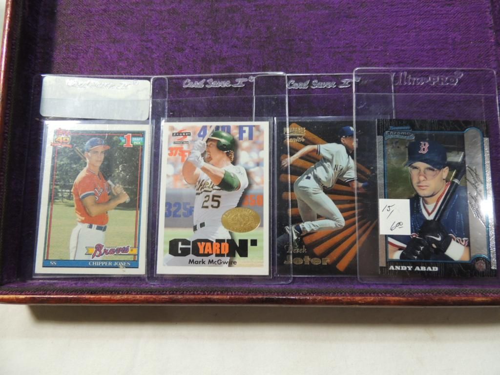 ANDY ABAD, DEREK JETER, MARK MCGWIRE, CHIPPER JONES. BASEBALL CARD. TRADING CARD. MIXED MAKERS MIXED DATES. COLLECTIBLE. VINTAGE CARD. PROTECTIVE PLASTIC SLEEVE. AS SHOWN. SEE PHOTO FOR MORE DETAILS.